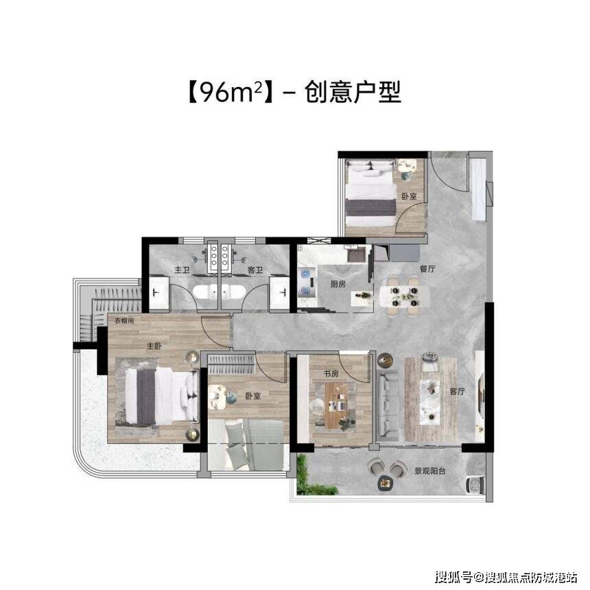 96㎡的四房户型拥有一个5.7米宽的超大阳台,部分房源可直接欣赏山景。四开间朝南的布局,让阳光洒满每一个角落。客餐厨一体化设计,增强了家庭成员之间的互动。主卧同样配备了270°飘窗,视野开阔,空间通透度极佳。100㎡的四房户型则做到了线米宽的超大阳台,不仅晾晒衣物方便,还可以摆放休闲家具,打造一个户外的休闲区。四开间朝南,每个房间的采光都非常出色。主卧飘窗视野开阔,适合对采光和视野有高要求的家庭。这两个户型在空间尺度和居住舒适度上都达到了很高的水准。