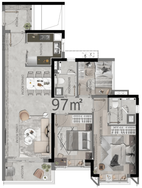 第二种户型则主打景观视野,主阳台朝北,正对千亩海珠湿地公园。虽然卧室两南两北分布,但每个房间都拥有良好的采光和通风。站在北向阳台上,湿地公园的 lush greenery 尽收眼底,仿佛置身于一幅巨大的风景画中。这种“园景房”的体验,是其他朝向无法比拟的。对于注重精神享受和自然景观的购房者来说,这种户型具有致命的吸引力。南北对流的设计,使得室内空气流通顺畅,即使在炎热的夏季,也能感受到穿堂风的凉爽。